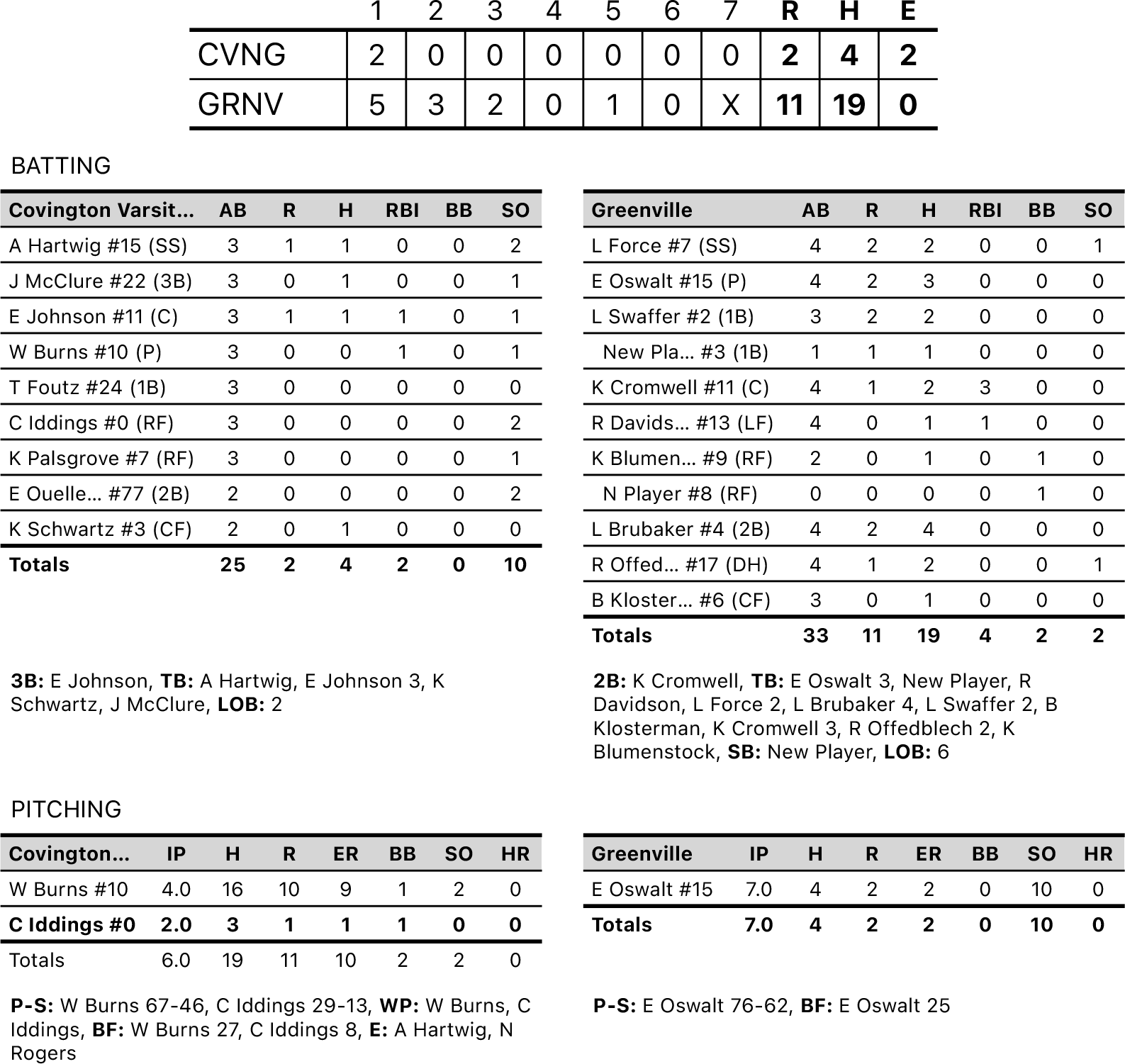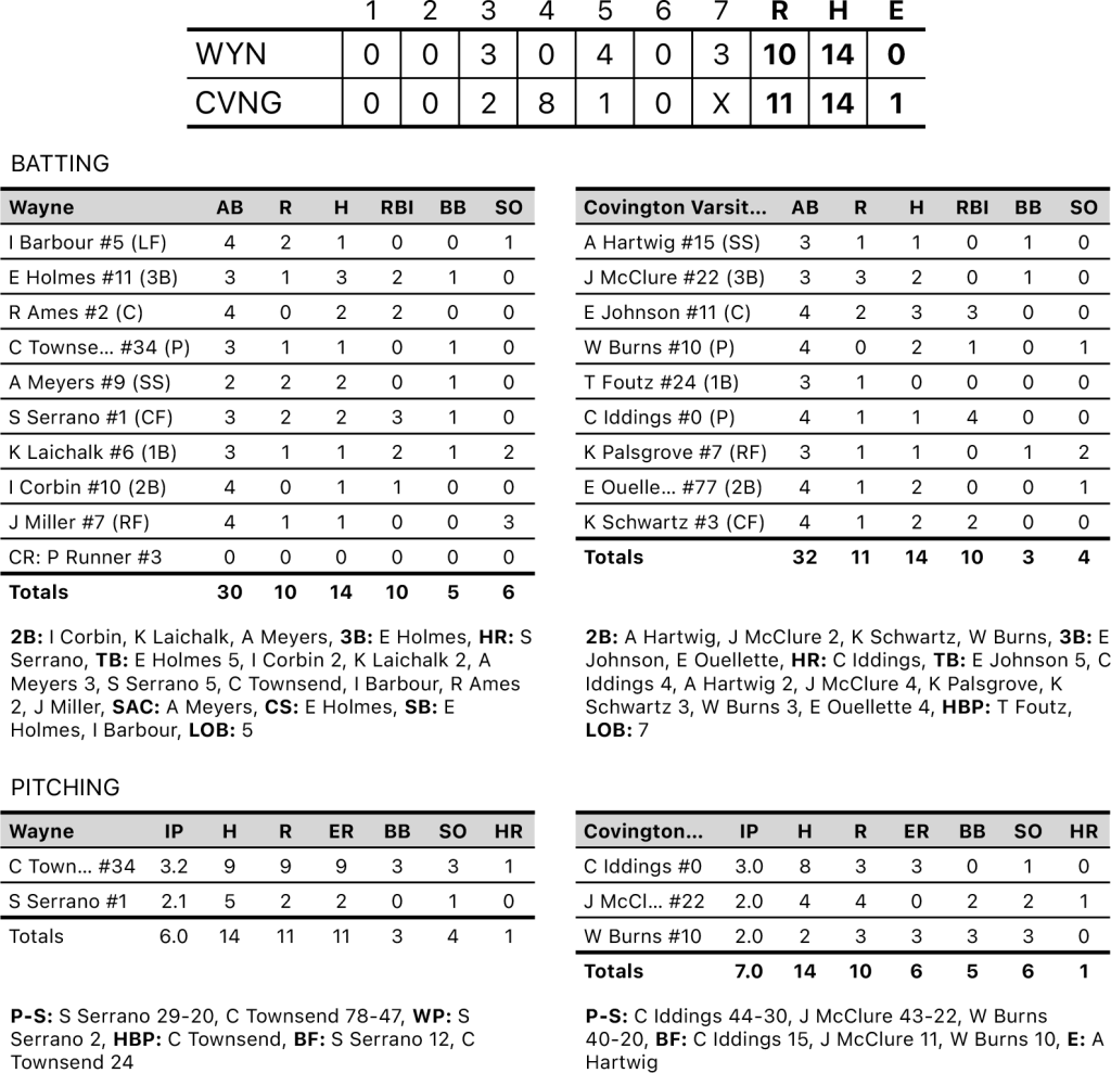 In the second game against Wayne, the first two innings were at 0-0 until Wayne scored three runs in the top of the third. Covington responded with two runs in the bottom of the third inning and eight runs in the fourth to take a 10-3 lead.